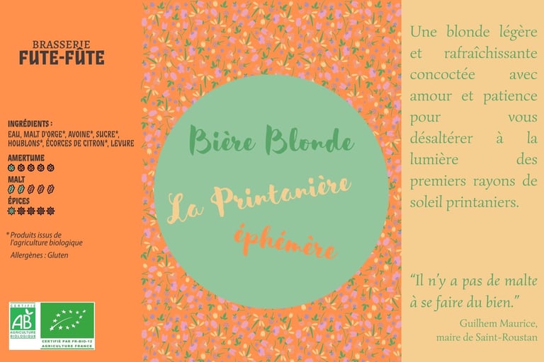 Venez profiter des animations et de la soirée du 14 juin et repartez avec "La Printanière". Issue d'un brassin unique, cette blonde légère saura vous désaltérer durant les chaleurs du printemps et de l'été. Commandez-la ici avant le 14 juin et profitez d'une réduction de 10€ sur le carton de 12*33cl ou de 6*75cl (4,6°). Votre commande vous attendra lors de la journée portes ouvertes de la brasserie (ou avant le mercredi après-midi ou sur RDV en appelant au 06 18 95 80 54)
